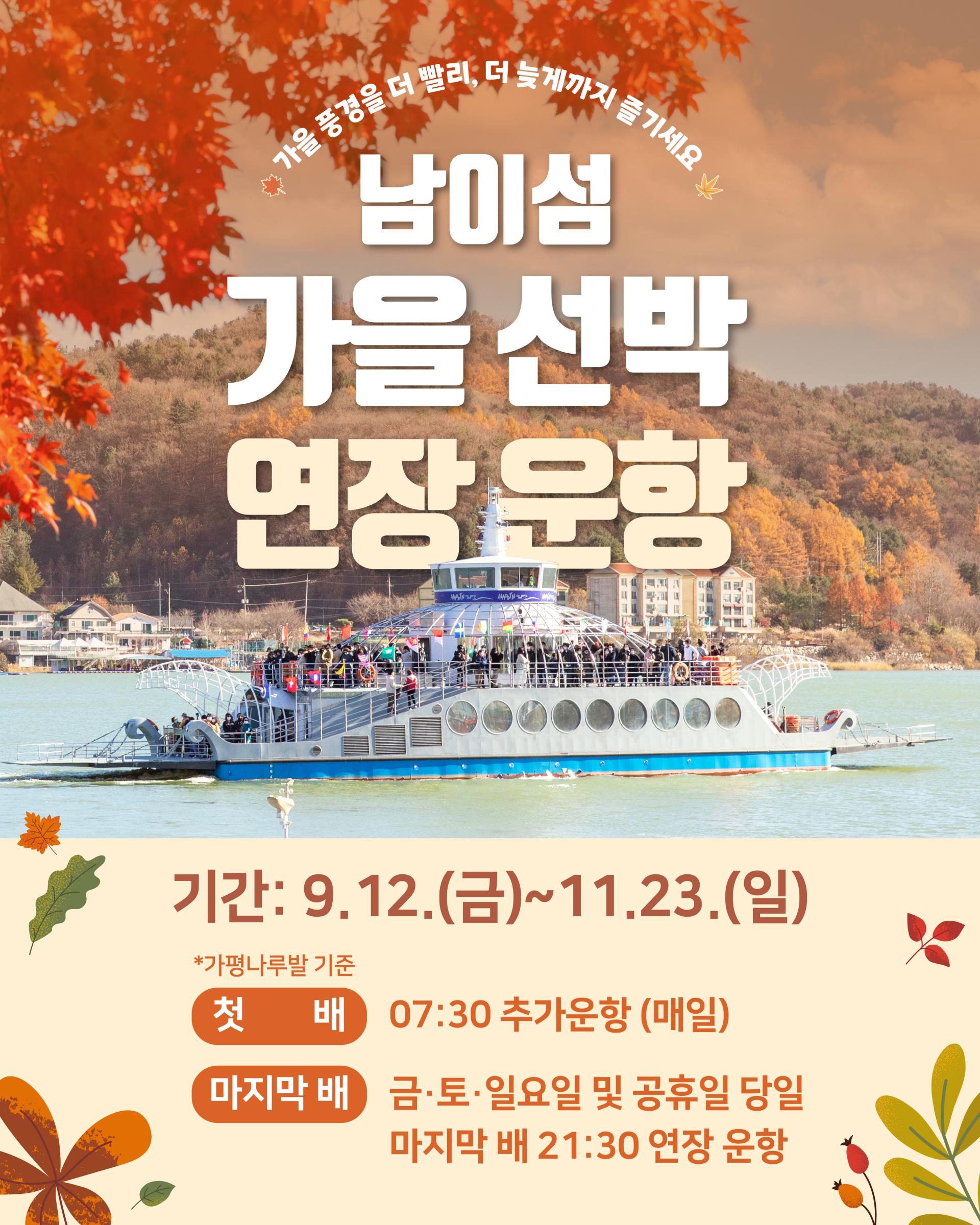 *가평나루발 기준첫 배: 07:30 추가 운항 (매일)마지막 배: 금・토・일요일 및 공휴일 당일 마지막 배 21:30 연장 운항